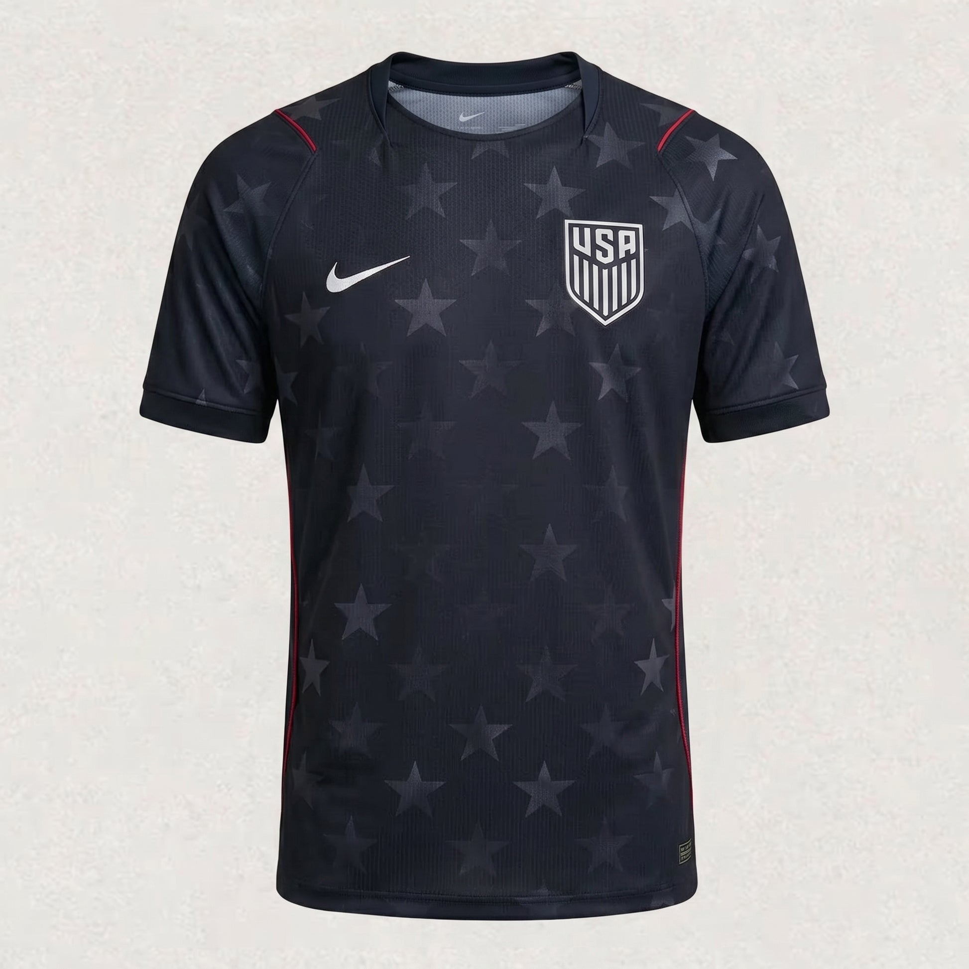 Engineered with high-performance moisture-wicking technology, the jersey ensures maximum breathability and all-day comfort, whether you're supporting the team from the stands or playing on the pitch. The design is accented by subtle red piping along the shoulders and side panels, providing a sharp visual balance that honors the American flag. The crisp white Nike swoosh and the monochromatic United States national crest complete a look built for top-tier global competition.